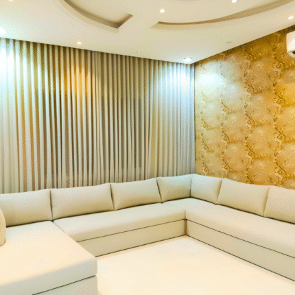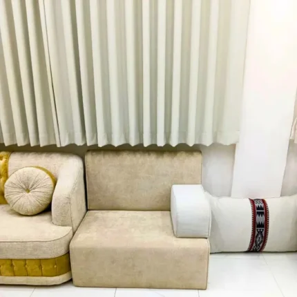 Elegant Beige Sofa with White Pleated Curtain | Minimal & Modern Home Décor