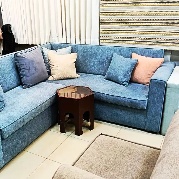 Crafted from high-quality soft fabric upholstery, the soothing blue tone adds calmness and depth to your interior. The combination of mixed cushions in pastel and deep shades enhances the visual texture, giving your space a warm and balanced ambiance.